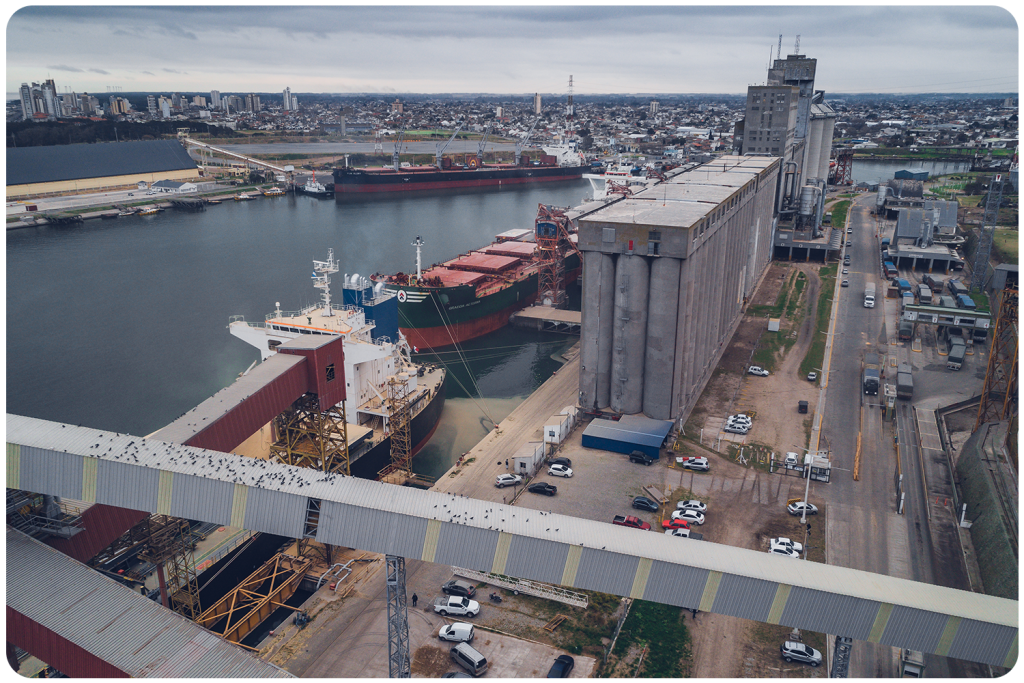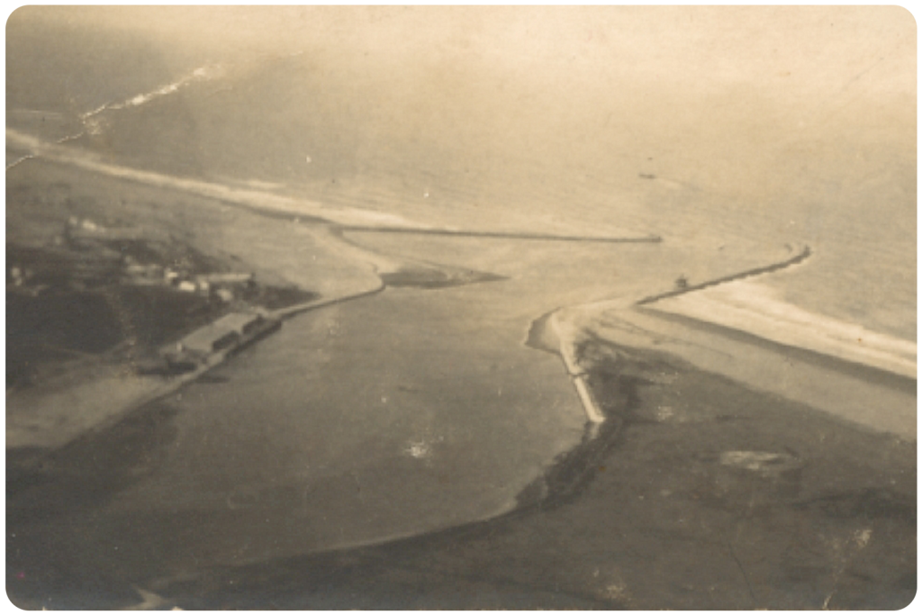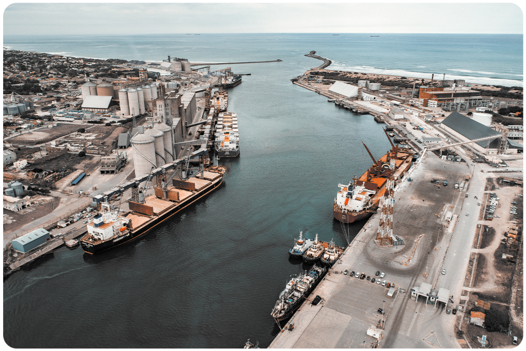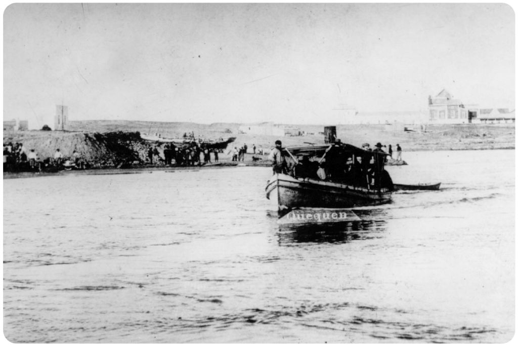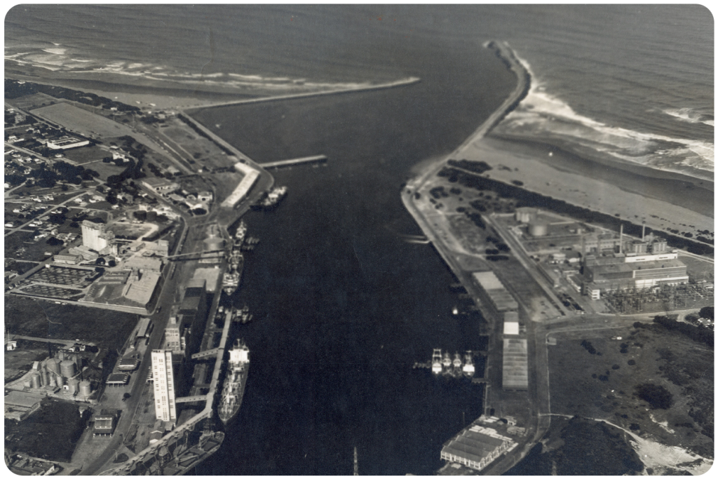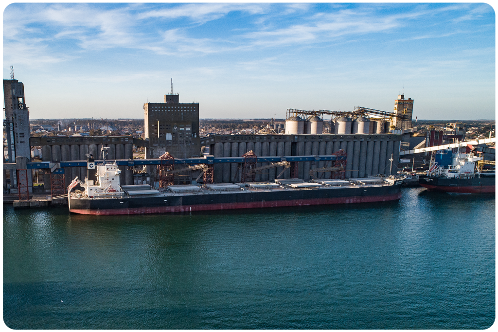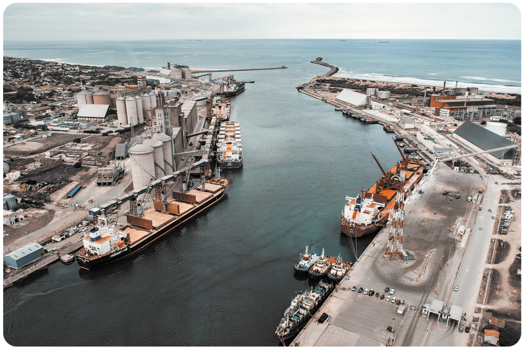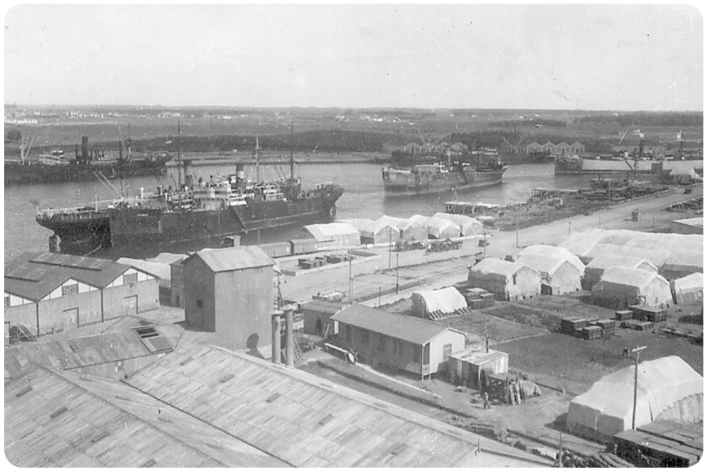 Las fotos muestran algunas personas trabajando en la construcción de Puerto Quequén y otras realizando tareas portuarias.
